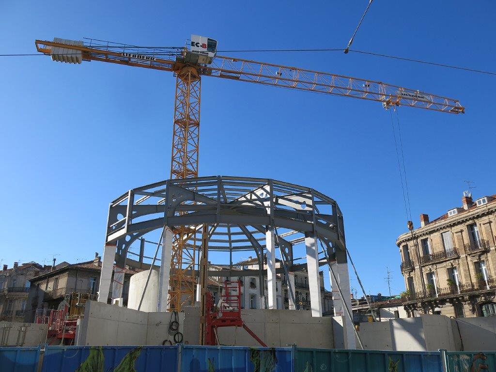 Le vendredi 12 janvier 2018, la structure métallique de la coupole des nouvelles halles Laissac à Montpellier est installée. Copyright : Edgar Chaptal