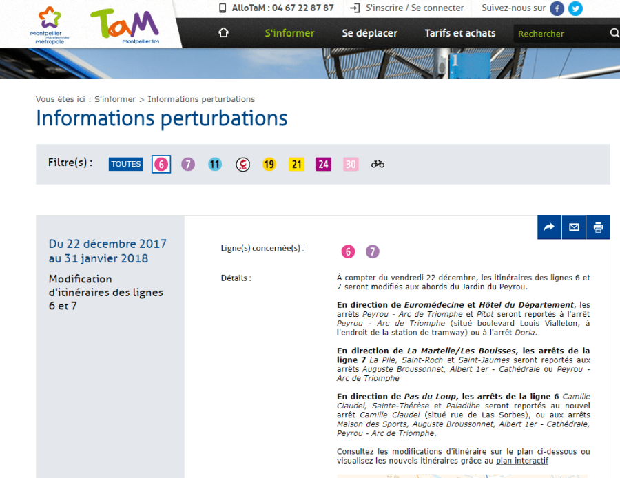 Capture d’écran de la page Informations perturbations du site internet TaM Montpellier 3M réalisée le samedi 13 janvier 2018, en début d’après-midi.