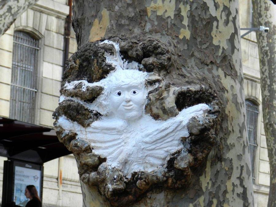Gros plan sur l’oeuvre d’art insolite et sans doute éphémère réalisée dans une ancienne plaie béante d’un platane centenaire occupant le bout du quai 4b de la station « Albert 1er – Cathédrale », boulevard Henri IV à Montpellier, le vendredi 19 janvier 2018. Copyright : Anje34