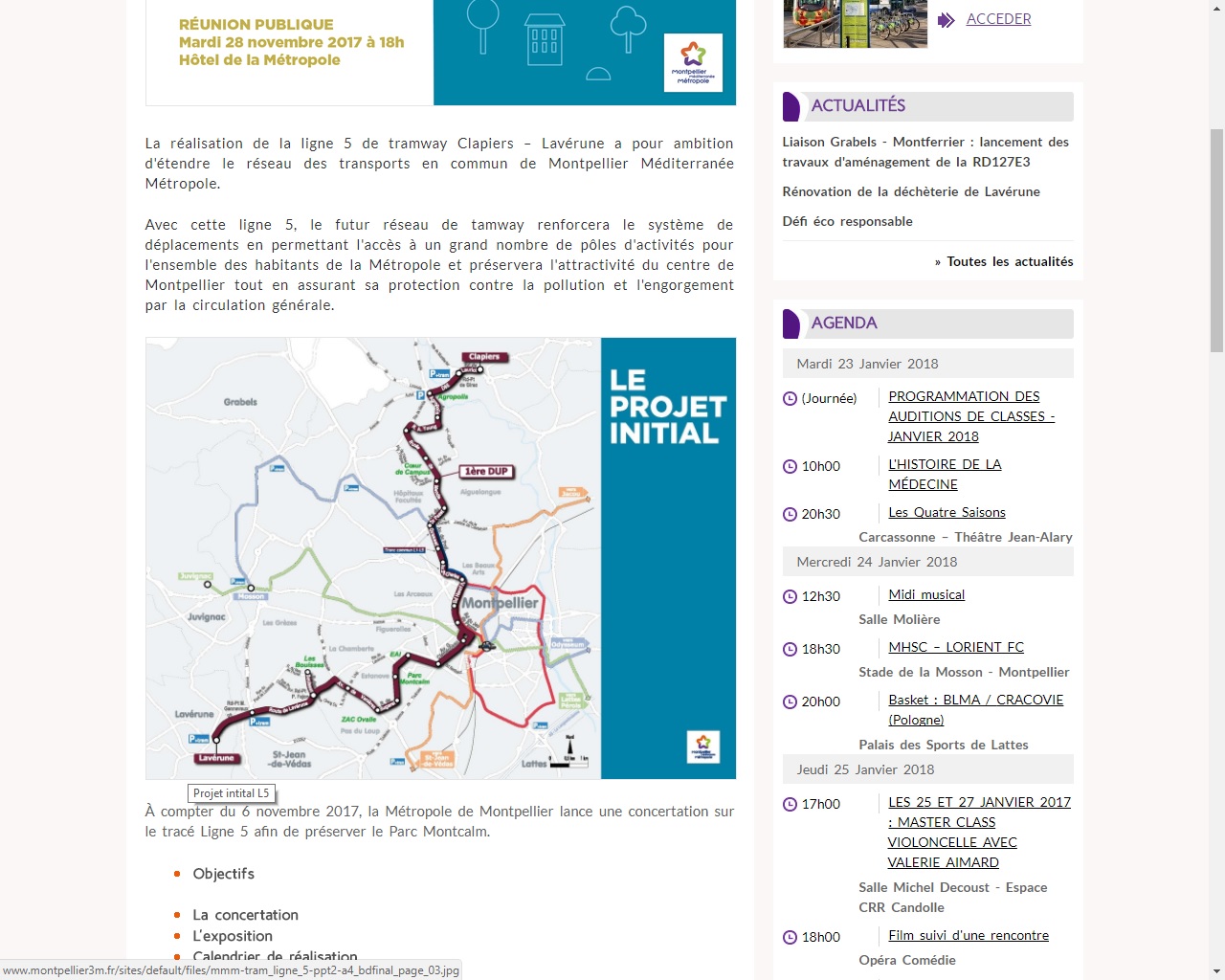 Capture d’écran de la page dédiée à la ligne 5 sur le site internet de Montpellier Méditerranée Métropole, le mardi 23 janvier 2018 à 13h15