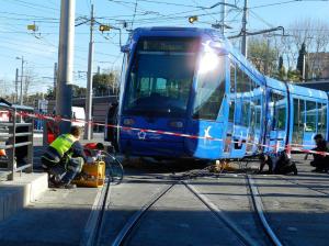 La motrice de tête de la rame 2025 Citadis 401 Alstom a déraillé à faible vitesse à l’approche de la station « Corum » commune aux lignes 1 et 4, le mardi matin 30 janvier 2018. Copyright : Anje34