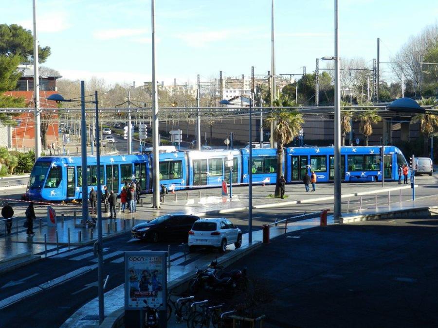 La motrice de tête de la rame 2025 Citadis 401 Alstom a déraillé à faible vitesse à l’approche de la station « Corum » commune aux lignes 1 et 4, le mardi matin 30 janvier 2018. Copyright : Anje34