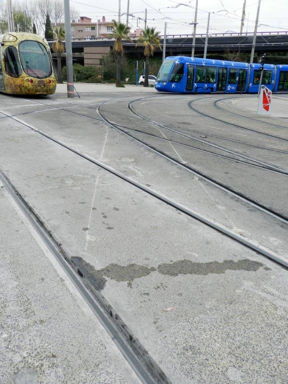 Place du 11 Novembre à Montpellier, la sortie des rails d’une motrice de la rame 2025 Citadis 401 Alstom, survenue le mardi matin 30 janvier 2018, a laissé des traces sur la plateforme du tramway. Photo prise le mercredi 31 janvier 2018. Copyright : Anje34