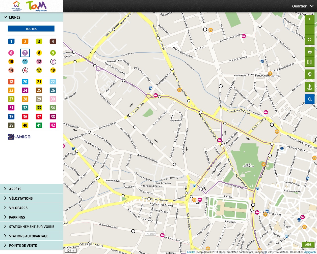 Capture d’écran des itinéraires modifiés sans concertation préalable de la ligne 7 dans le secteur rue du Faubourg Saint-Jaumes et Peyrou, le samedi 3 février 2018. Document TaM Montpellier 3M