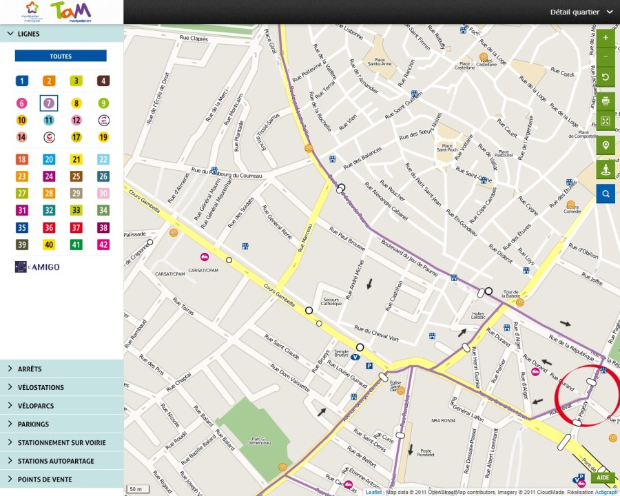 Capture d’écran du plan interactif TaM Montpelier 3M où l’itinéraire des lignes 6 et 7 de bus urbains, via la rue Marceau et le cour Gambetta, est occulté. Capture d’écran réalisée le samedi 3 février 2018