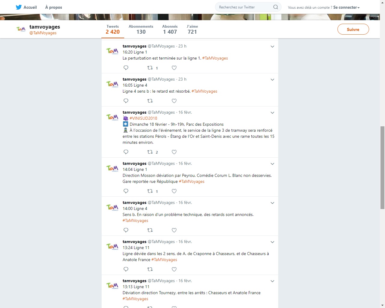 Capture d’écran du compte Twitter de TaM Montpellier 3M où il est question de perturbations sur la ligne 4 sens b et la ligne 1 direction « Mosson », le vendredi 16 février 2018 après-midi. Capture d’écran réalisée le samedi 17 février 2018