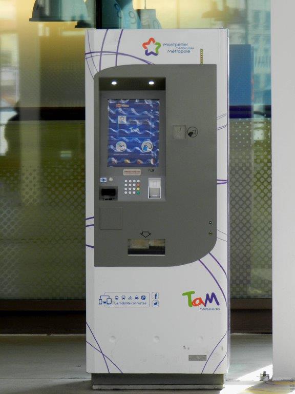 Distributeur automatique de titres de transport TaM Montpellier 3M placé dans le hall supérieur de la gare de Montpellier Saint-Roch. Photo prise le vendredi 23 février 2018. Copyright : Anje34