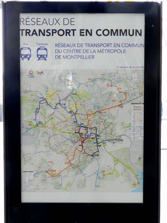 Plan du réseau TaM Montpellier 3M consultable dans le hall supérieur de la gare de Montpellier Saint-Roch. Photo prise le vendredi 23 février 2018. Copyright : Anje34