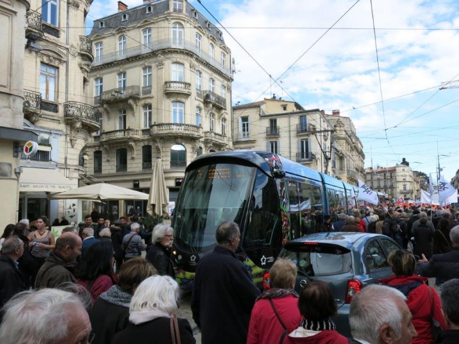 Le jeudi 15 mars 2018 après-midi à Montpellier, place Edouard-Adam, une rame de la ligne 3 tentait de se frayer un chemin en direction du boulevard du Jeu-de-Paume au milieu des manifestants, retraités et personnels des Ehpad. Copyright : Edgar Chaptal