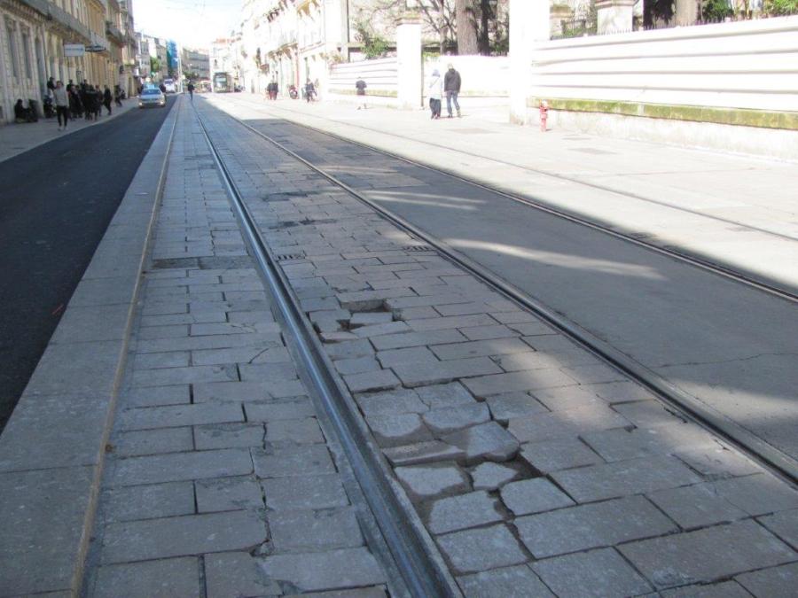 Autre aperçu de l’état fort dégradé de la plateforme des lignes 3 et 4 de tramway, rue de la République à Montpellier, le samedi 17 mars 2018. Copyright : Edouard Paris