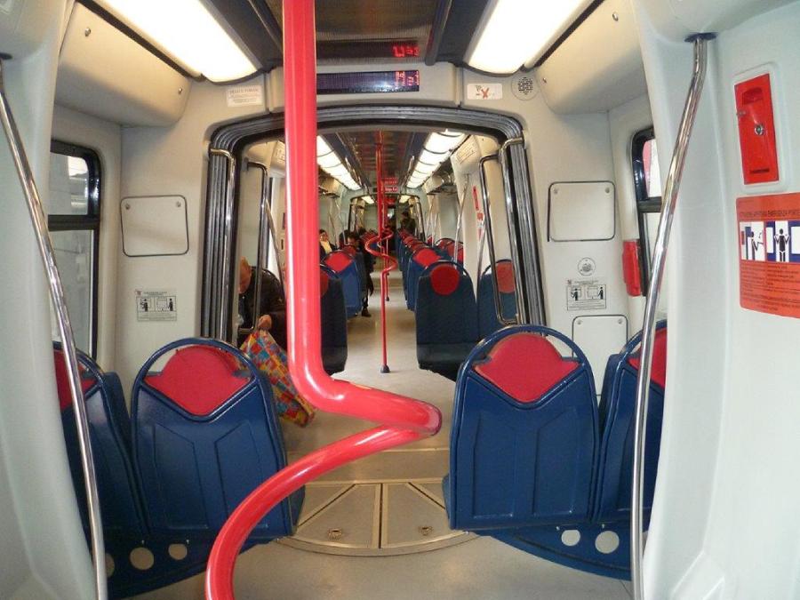 Aménagement intérieur d’une automotrice triple caisse Metrostar ETR du réseau Circumvesuviana photographié en gare de Naples Porta Nolana, le lundi 5 mars 2018. Copright : Edouard Paris