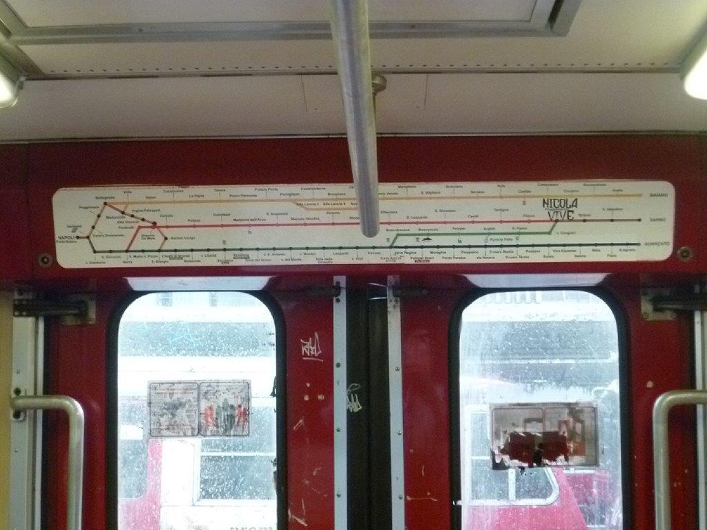 Thermomètre des lignes du réseau Circumvesuviana placé au-dessus d’une porte à double ventail à l’intérieur d’une automotrice triple caisse SFSM ETR photographié le mardi 6 mars 2018 en gare de Naples Porta Solana. Copyright : Edouard Paris