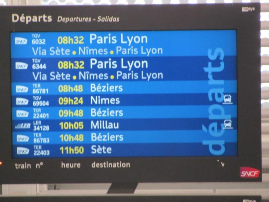 Ecran d’information en gare de Montpellier Saint-Roch annonçant un TGV à destination de Paris gare de Lyon via Sète, le dimanche 1er avril 2018. Copyright : Edouard Paris