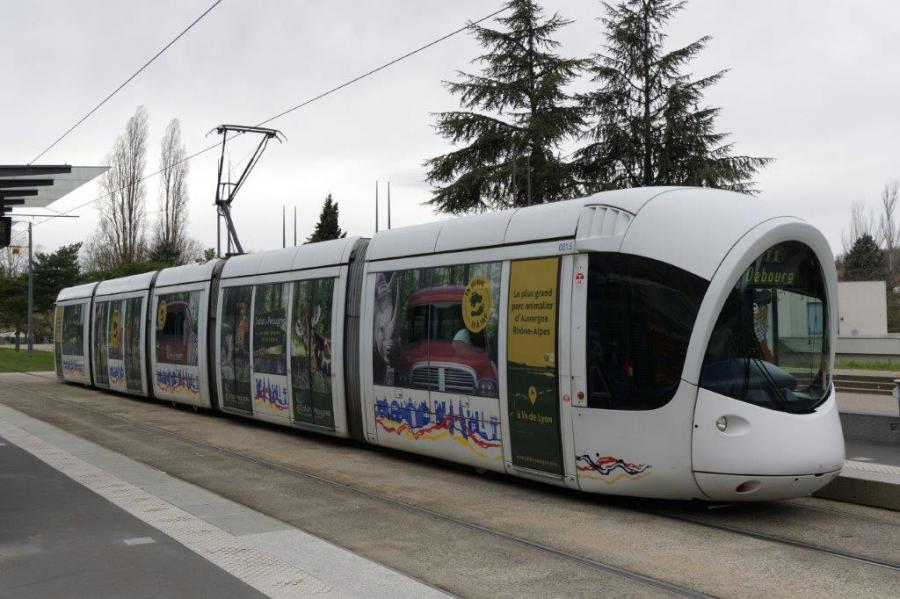 Publicité commerciale Safari de Peaugres sur la rame 815 Citadis 302 Alstom photographiée à Villeurbanne à la station « Université Lyon I » commune aux lignes T1 et T4, le lundi 2 avril 2018. Copyright : Yvon Brument