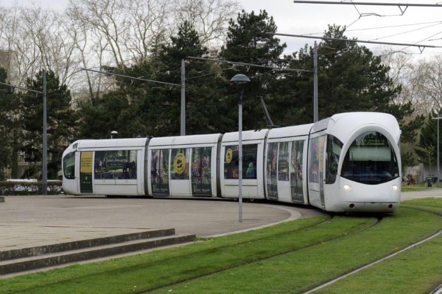 Publicité commerciale Safari de Peaugres sur la rame 854 Citadis 302 Alstom photographiée à Villeurbanne à l’approche de la station « Université Lyon I » commune aux lignes T1 et T4, le lundi 2 avril 2018. Copyright : Yvon Brument