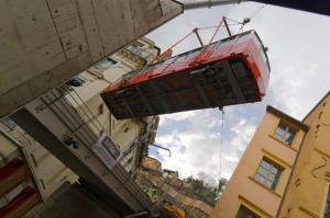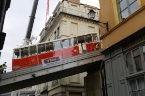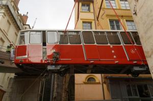 - Rue Tramassac à Lyon, la rame mono-caisse numéro 1 rénovée du funiculaire de Fourvière est soulevée par une grue télescopique, le mercredi 4 avril 2018. Copyright : Yvon Brument