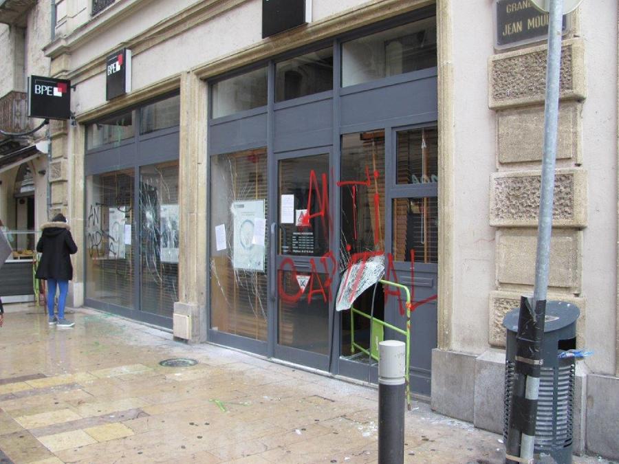 La devanture de la BPE, à l’angle de la place Edouard-Adam et de la Grand’rue Jean-Moulin à Montpellier, a été victime d’éléments incontrôlés, le samedi après-midi 14 avril 2018. Copyright : Edouard Paris