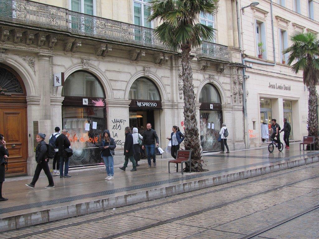 Boulevard du Jeu-de-Paume à Montpellier, des vitrines de l’emblématique boutique Nespresso ont été taguées et abîmées par des éléments incontrôlés de la manifestation de la divergence des luttes, le samedi après-midi 14 avril 2018. Copyright : Edouard Rollin