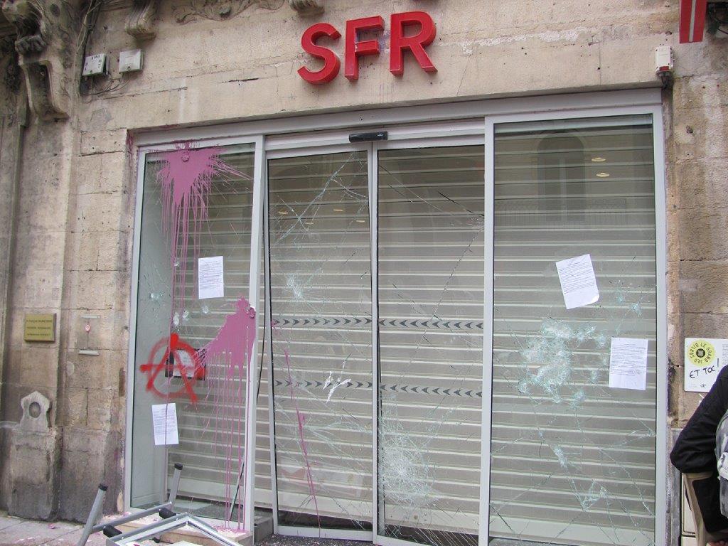 Boulevard du Jeu-de-Paume à Montpellier, rideau tiré et devanture dégradée de la boutique SFR, le samedi après-midi 14 avril 2018. Copyright : Edouard Paris