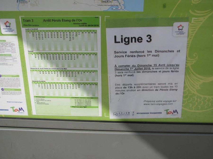 Fiche horaire du terminus « Pérols – Etang de l’Or » de la ligne 3, valable du lundi 9 avril au vendredi 6 juillet 2018, photographiée le dimanche 15 avril 2018. Copyright : Edouard Paris