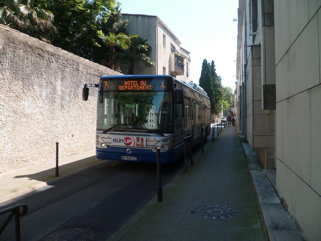 Un bus urbain de la ligne 7 est photographié au milieu de l’étroite rue du Carré-du-Roi à Montpellier, le samedi 21 avril 2018. Copyright : Edouard Paris
