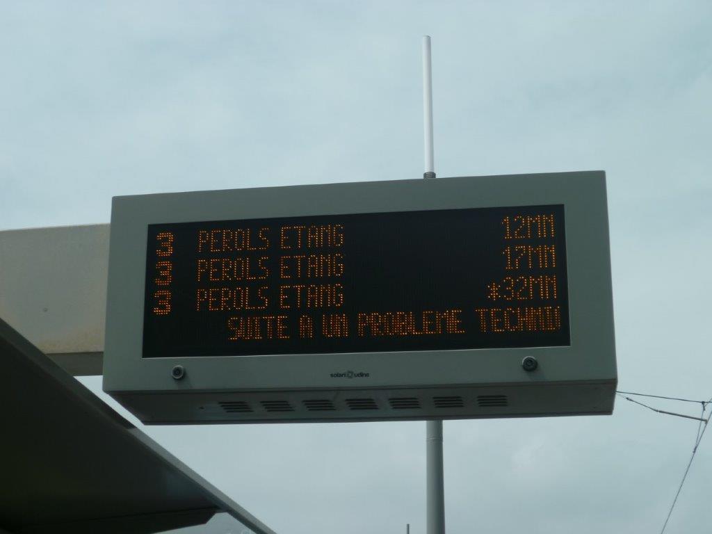 A 12h35, le samedi 28 avril 2018, le tableau électronique d’information de la station « Tonnelles » de la ligne 3, quai directions « Pérols – Etang de l’Or » et « Lattes Centre », annonçait d’importants retards. Copyright : Edouard Paris