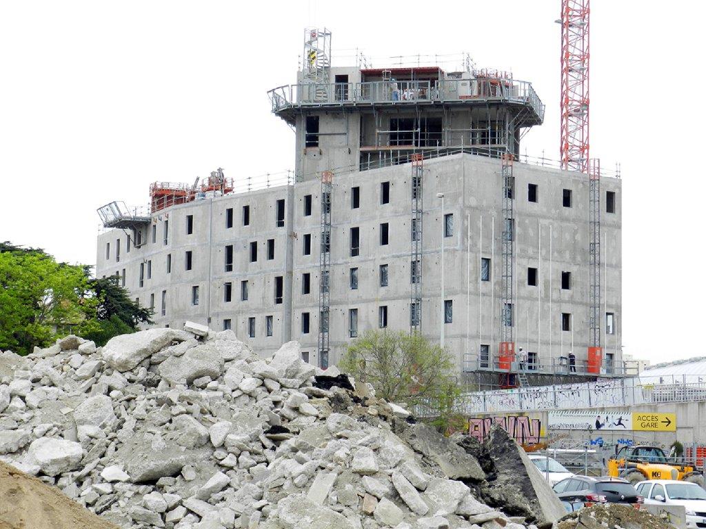 Vue sur le chantier « Hôtel St-Roch – Belaroia », le lundi 23 avril 2018, où les tiges de fixation des éléments décoratifs ont été fixées sur la façade donnant sur la rue Pagézy. Copyright : Anje34