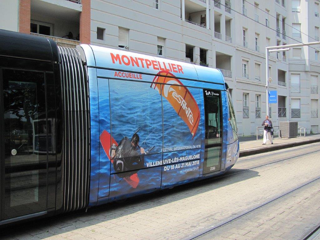 Pelliculage Festikite sur un côté de la motrice de queue de la rame 2099 Citadis 402 Alstom multiligne photographié à la station « Moularès (Hôtel de Ville) », le samedi 5 mai 2018. Copyright : Edouard Paris