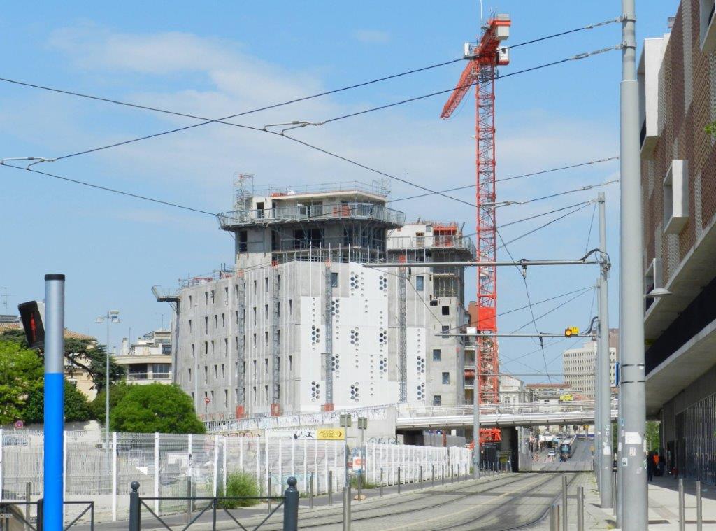 Le complexe architectural « Hôtel St-Roch – Belaroia » en construction photographiée depuis la rue Alexandra David-Néel à Montpellier, le dimanche 6 mai 2018. Copyright : Anje34
