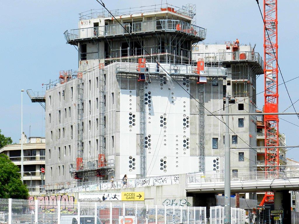 Le complexe architectural « Hôtel St-Roch – Belaroia » en construction photographiée depuis la rue Alexandra David-Néel à Montpellier, le lundi 7 mai 2018. Copyright : Anje34