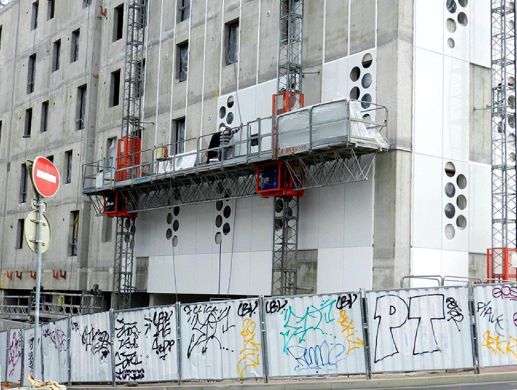Installation d’éléments décoratifs de façade du complexe architectural « Hôtel St-Roch – Belaroia » en construction, côté rue Pagézy à Montpellier, le mercredi 9 mai 2018. Copyright : Anje34
