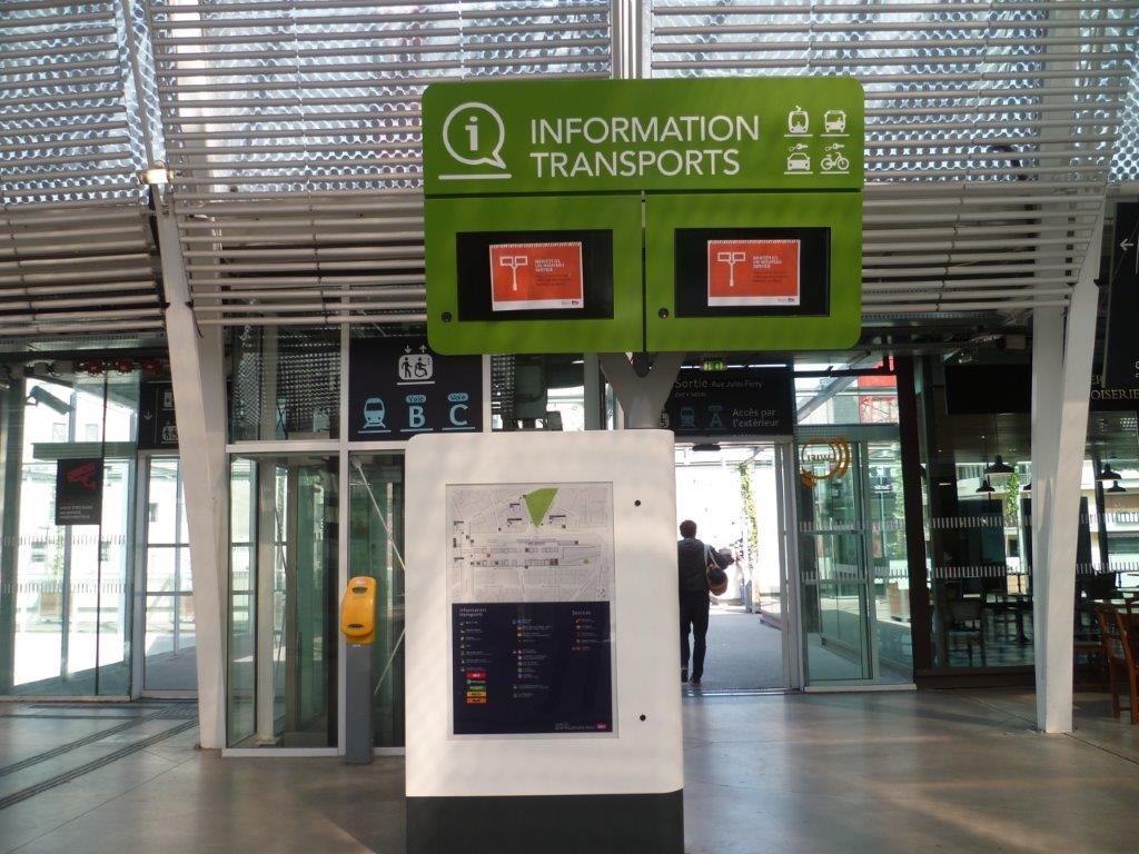 Trois mois après leur installation, les écrans des deux totems installés dans le hall supérieur de la gare de Montpellier Saint-Roch n’étaient pas opérationnels. Photo d’un des deux totems prise le lundi 21 mai 2018. Copyright : Edouard Paris