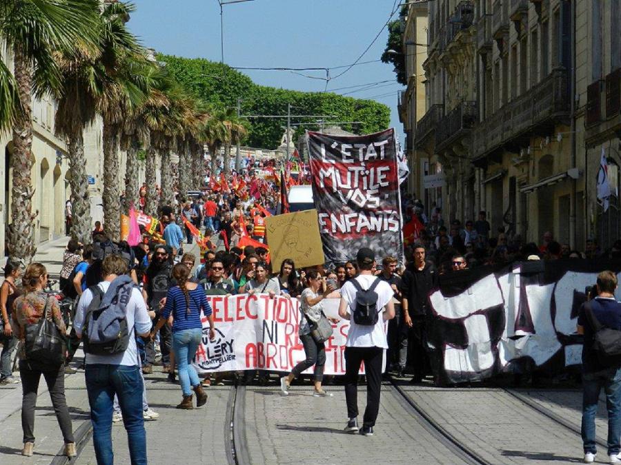 A Montpellier, les manifestations empruntent régulièrement le boulevard Ledru-Rollin où circulent les rames de la ligne 4 depuis le samedi 2 juillet 2016. Photo prise le samedi 26 mai 2018. Copyright : Anje34