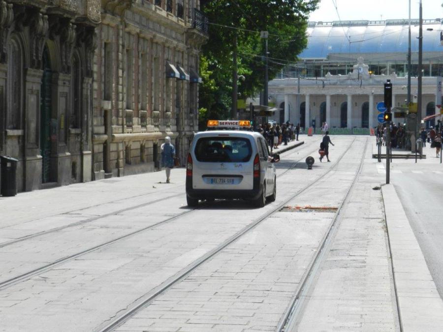 Rue de la République à Montpellier, un véhicule sérigraphié TaM Montpellier 3M emprunte la plateforme du tramway alors que son conducteur aurait pu tout aussi bien rouler sur la voie routière à sens unique parallèle à cette plateforme, ce qui lui aurait épargné de faire un écart. Photo prise le samedi 26 mai 2018. Copyright : Anje34