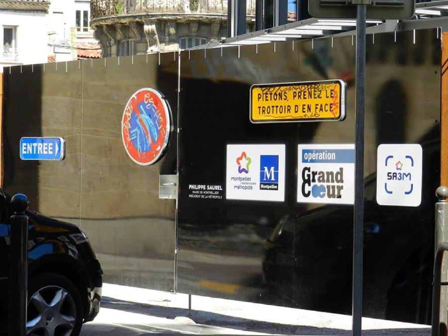 Le même portail sur lequel ont été fixés des panneaux, dont un signé Philippe Saurel, à l’angle de la place Alexandre-Laissac et de la rue Anatole-France, photographié le vendredi 1er juin 2018. Copyright : Anje34