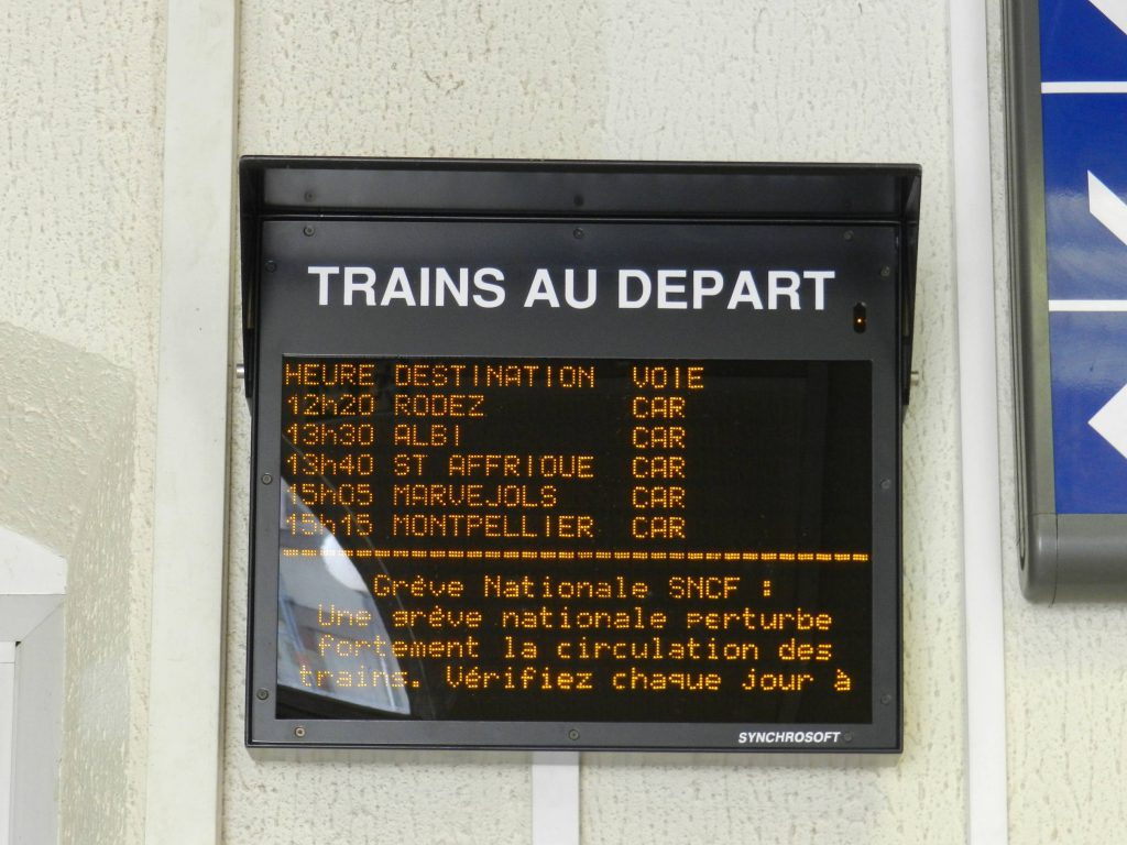 Ecran d’information des départs de la gare de Millau photographié le samedi 2 juin 2018, jour de grève à la SNCF. Copyright : Anje34