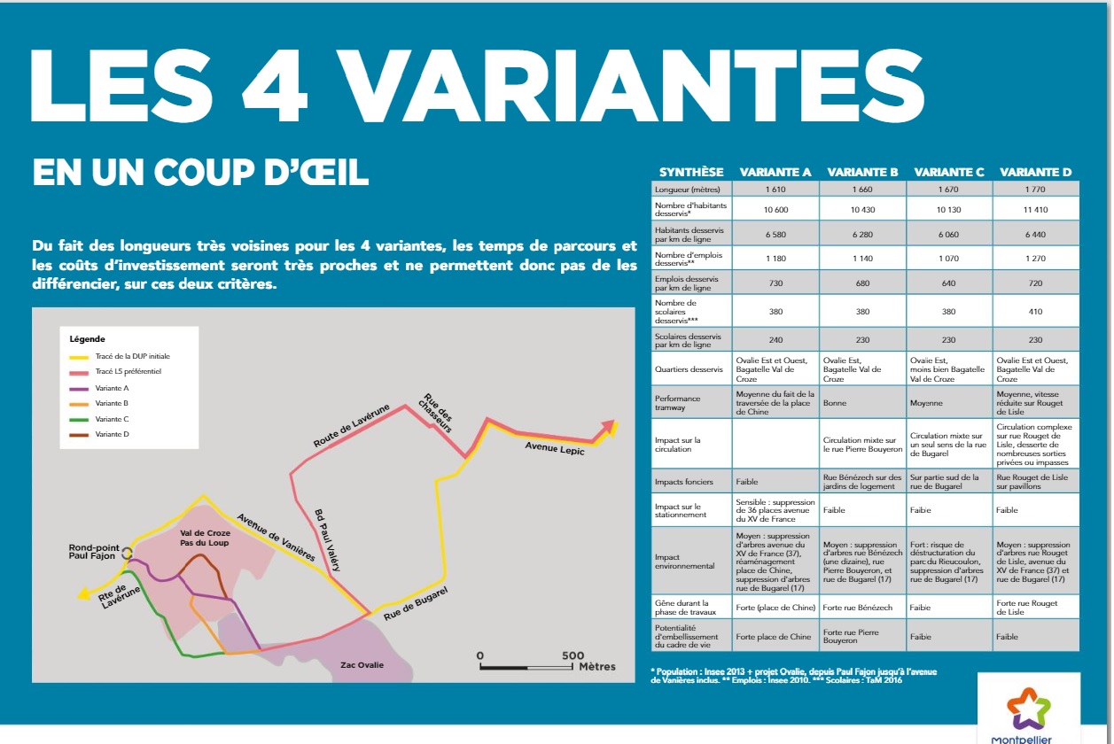Future ligne 5 de tramway, les quatre variantes du tracé via la ZAC Ovalie et le quartier Val de Croze consultables d’un seul coup d’œil. Document Montpellier Méditerranée Métropole juin 2018
