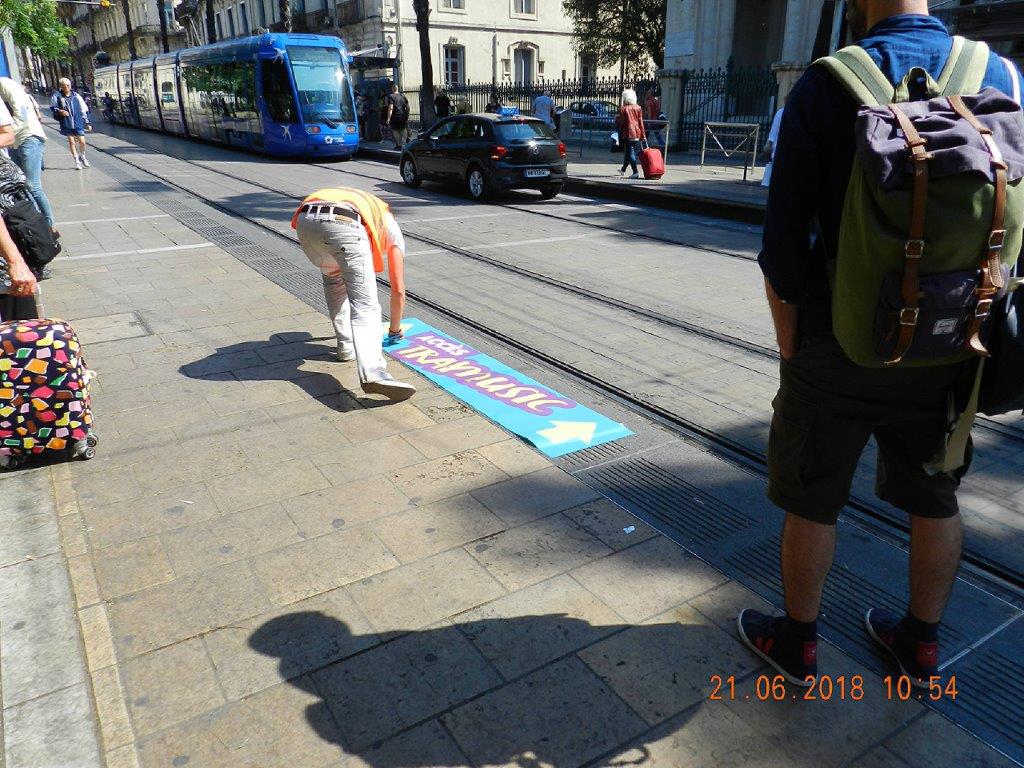 Marquage au sol de l’accès au TraMusic 2018 en train d’être appliqué sur un quai de la station « Gare Saint-Roch », rue Maguelone à Montpellier, le jeudi 21 juin 2018. Copyright : Anje34