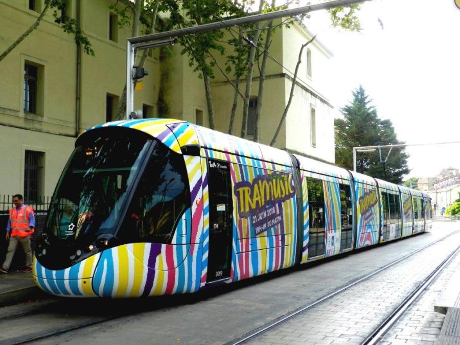 La rame 2099 Citadis 402 Alstom, revêtue du pelliculage intégral TraMusic, est photographiée à la station « Place Albert 1er – Saint-Charles », le jeudi 21 juin 2018. Copyright : Anje34