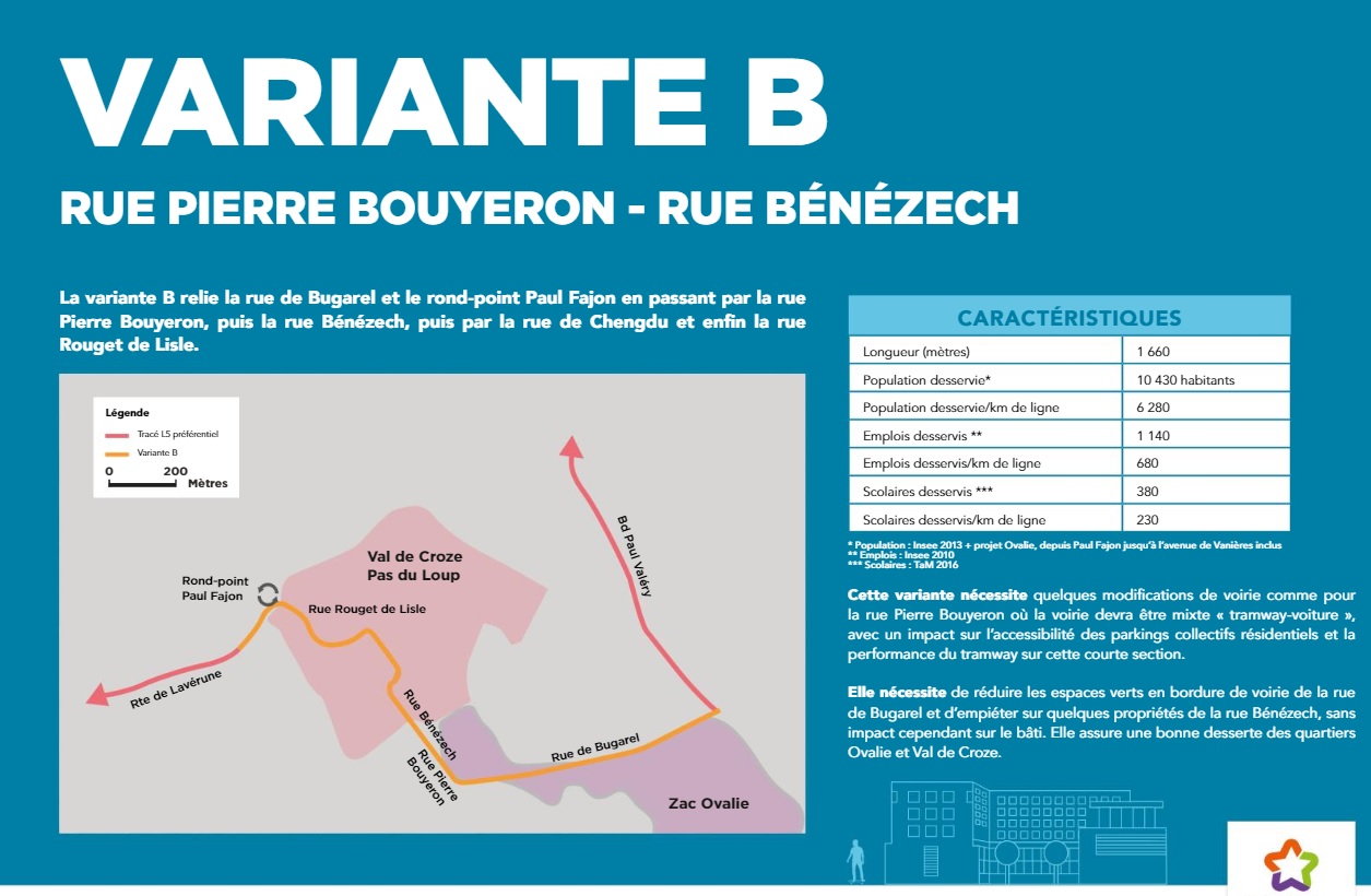 Tracé de la ligne 5 entre l’avenue de Vanières et le rond-point Paul-Fajon sur la commune de Montpellier, la variante B choisie à l’issue de la réunion publique de concertation du mercredi 27 juin 2018. Document Montpellier Méditerranée Métropole
