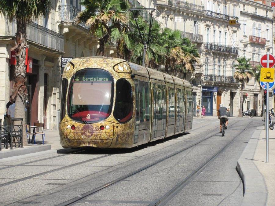 La rame 2031 Citadis 302 Alstom, opérant sur la ligne 4 sens 4b, est photographiée boulevard du Jeu-de-Paume à Montpellier, entre les stations « Saint-Guilhem – Courreau » et « Observatoire », le samedi 30 juin 2018. Copyright : Edouard Paris