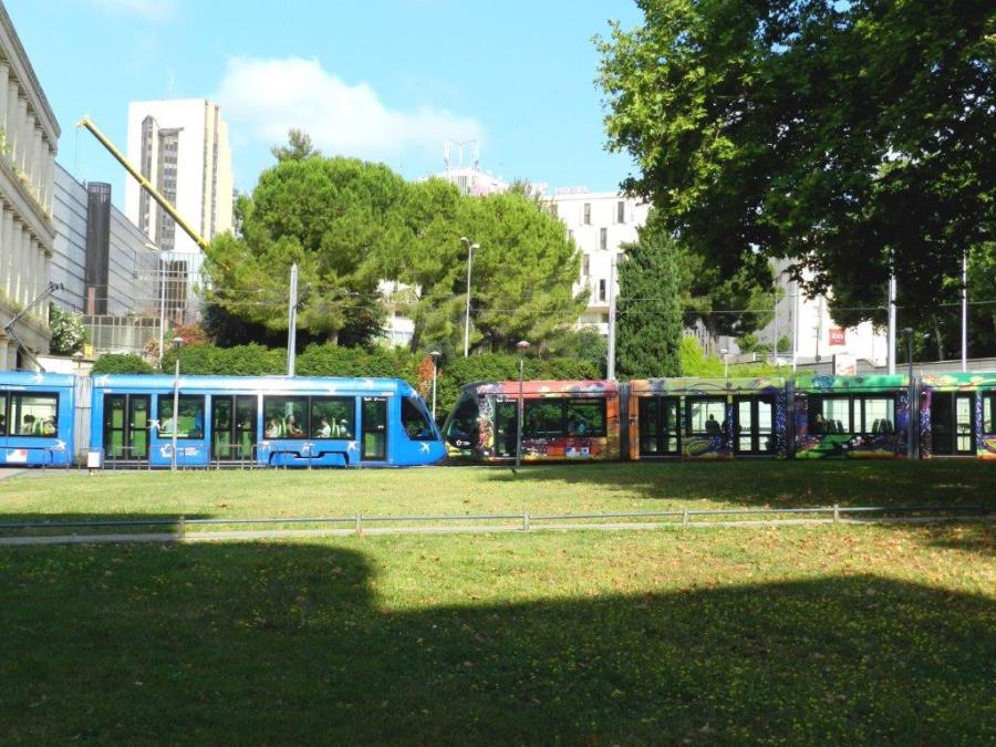 Les rames de la ligne 1, bleues aux hirondelles, passeront-elles un jour le relais aux rames de la ligne 3 sur la section desservant les stations « Du Guesclin », « Antigone », « Léon Blum », « Place de l’Europe » et « Rives du Lez ». Photo prise le mardi 3 juillet 2018. Copyright : Anje34
