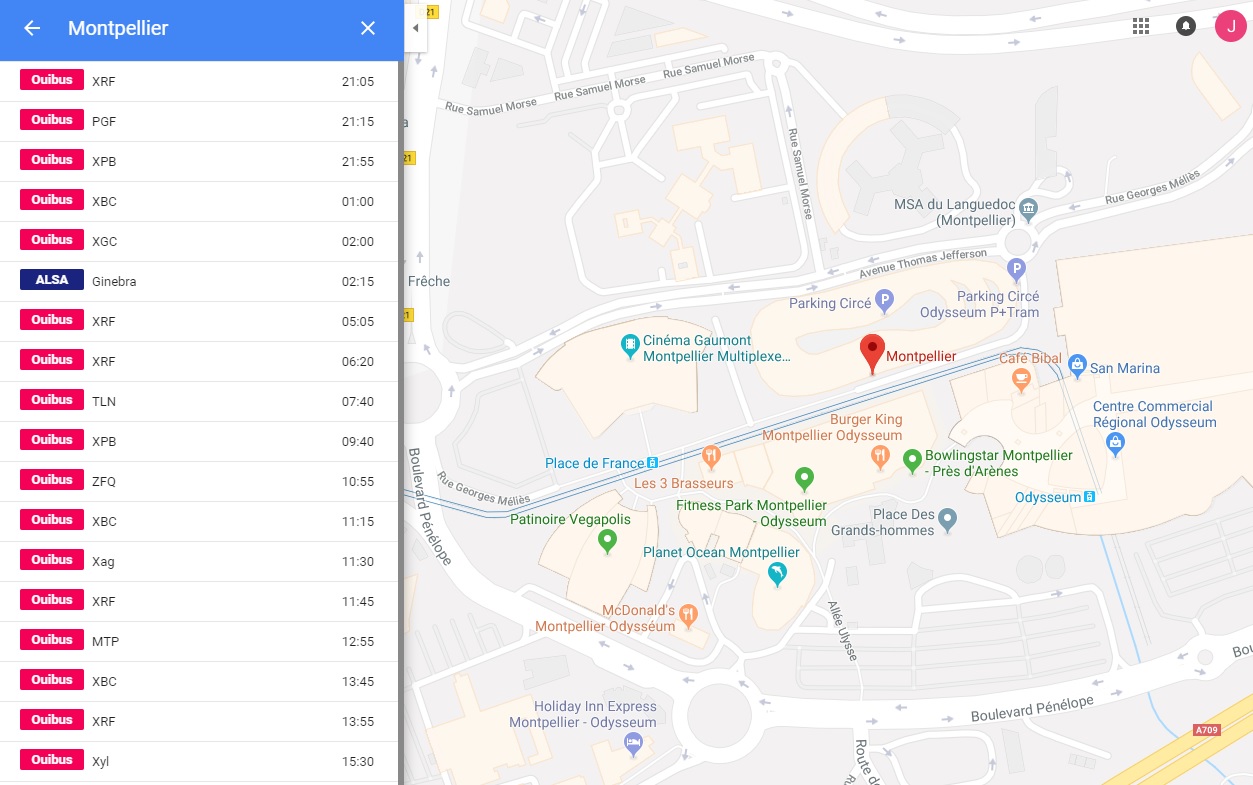 Capture d’écran des horaires des vendredi 6 et samedi 7 juillet 2018 à l’arrêt « Ouibus et Alsa » quartier Odysseum à Montpellier disponibles sur Google Maps, le vendredi 6 juillet 2018 à 19h43