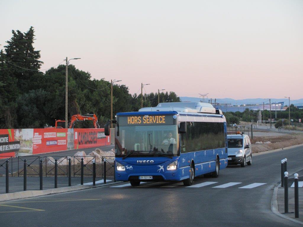 Photographie du premier bus assurant la navette entre la place de France et la gare de Montpellier Sud de France, le samedi 7 juillet 2018 à 6h14, à la hauteur de l’arrêt « Cambacérès ». A bord une dizaine de personnes. Copyright : Edouard Paris
