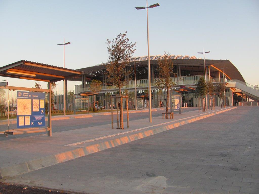 Parvis sud de la gare de Montpellier Sud de France où trois abris sont dédiés à la navette TaM Montpellier 3M assurant la liaison avec la place de France. Photo prise le samedi 7 juillet 2018. Copyright : Edouard Paris