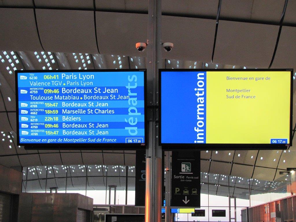 Tableau des départs en gare de Montpellier Sud de France, le samedi 7 juillet 2018 à 6h17. Copyright : Edouard Paris
