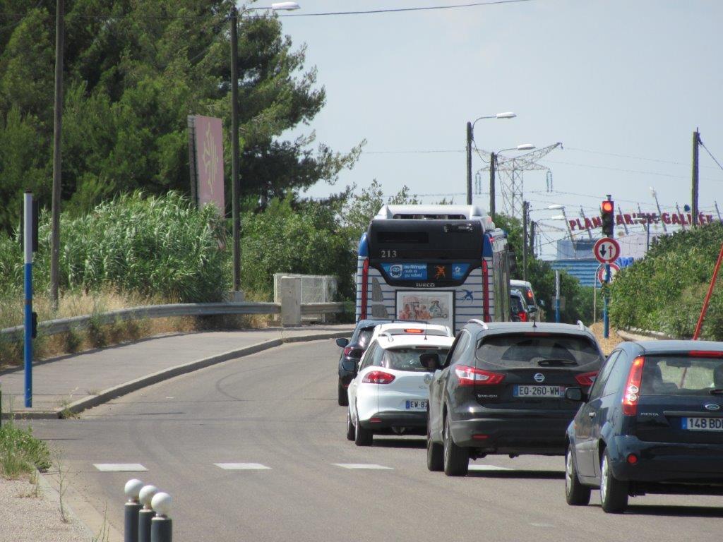 Un gros point noir pour les navettes assurant la liaison entre la gare de Montpellier Sud de France et la place de France, le franchissement alterné du pont réduit à une voie qui enjambe l’A709. Photo prise le samedi 14 juillet 2018. Copyright : Edouard Paris