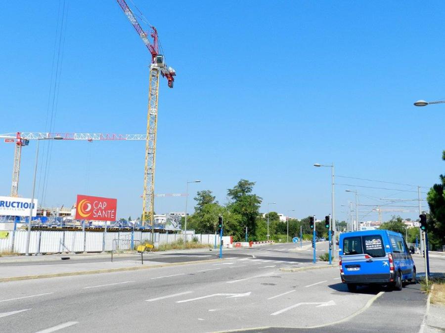 Vue partielle du chantier de la future polyclinique Saint-Jean à Saint-Jean-de-Védas, le 26 juillet 2018. Sur la photo à droite, l’exemple à ne pas suivre. Copyright : Anje34