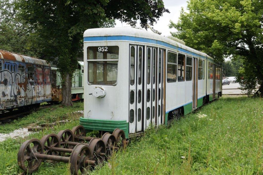 En gare de Gouarec, Chemin de fer touristique de Bon Repos, le jeudi 26 juillet 2018, photographie côté portes de la motrice PCC articulée unidirectionnelle 952 (ancienne numérotation 552) du tramway de Saint-Etienne, construite en 1968 par La Brugeoise et Nivelles. Copyright : Yvon Brument