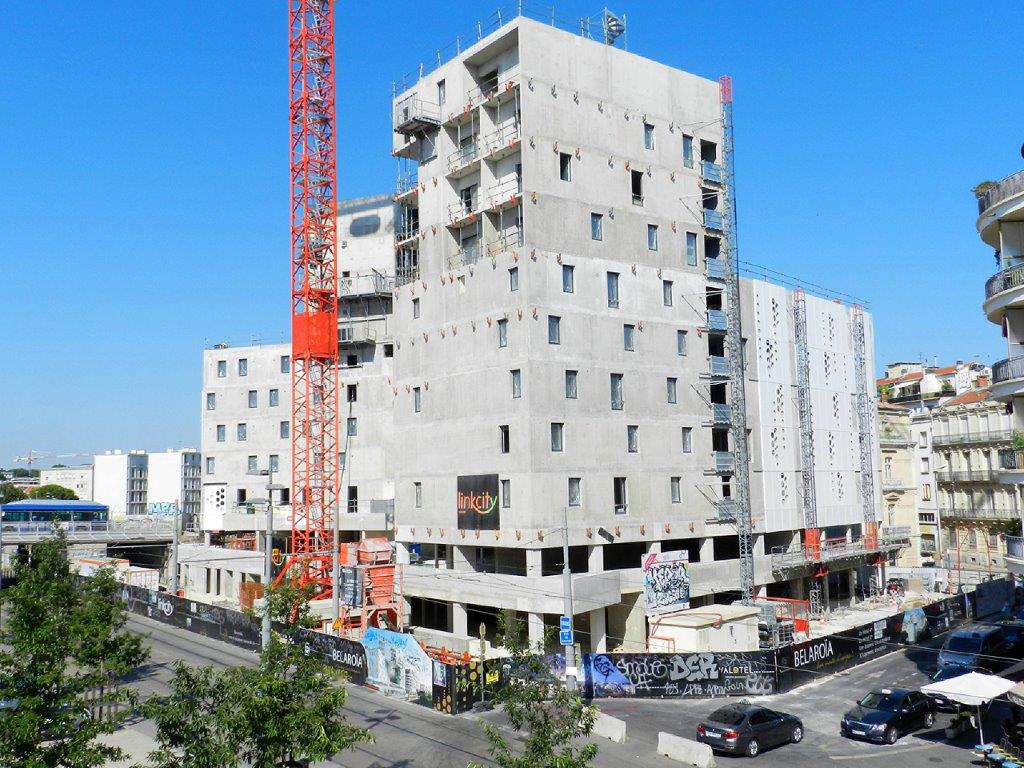 Vue du chantier « Hôtel St-Roch – Belaroia » depuis la terrasse de la gare de Montpellier Saint-Roch donnant sur la rue Jules-Ferry, le samedi 30 juin 2018. Copyright : Anje34